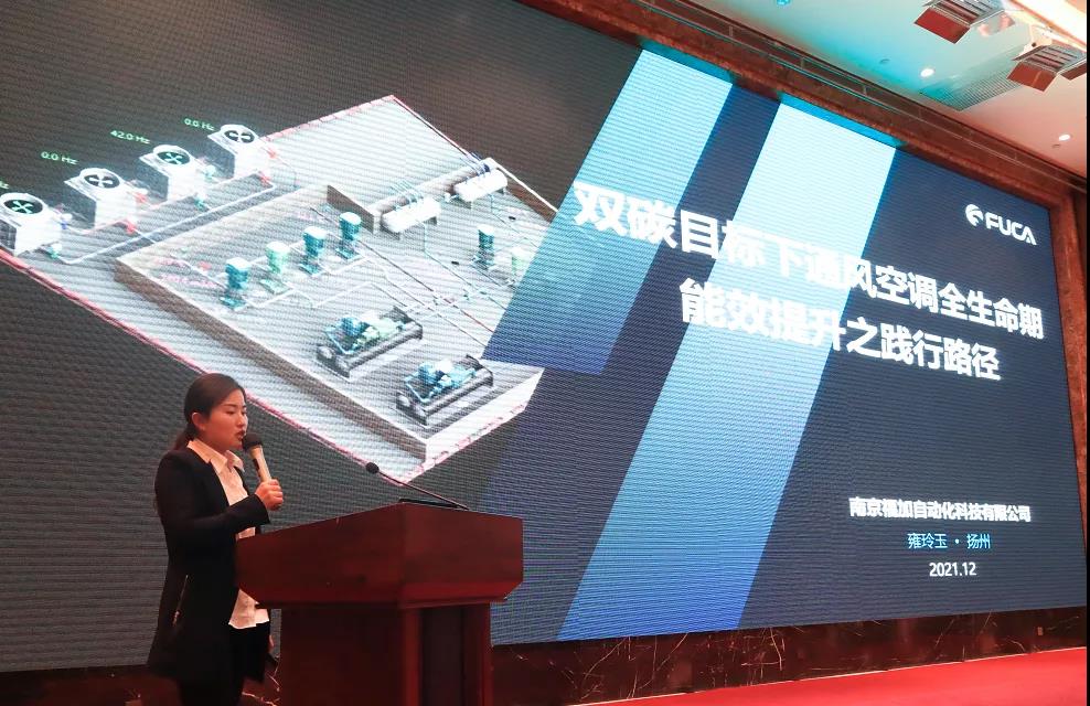 福加應邀出席會議,市場中心高級主管雍玲玉現(xiàn)場分享了福加在暖通空調領域方面的技術成果以及關于空調能效提升建設的實踐和思考。