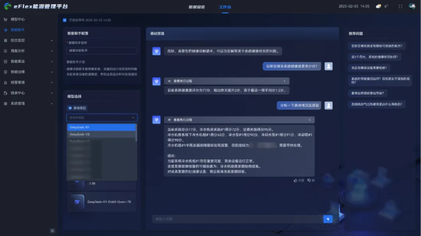 接入DeepSeek后,提供豐富的預(yù)訓(xùn)練模型選擇,涵蓋通用與暖通行業(yè)專(zhuān)用的大規(guī)模及輕量級(jí)模型,用戶(hù)可根據(jù)具體業(yè)務(wù)場(chǎng)景靈活選用,并支持模型性能評(píng)估、快速部署及實(shí)時(shí)測(cè)試,滿(mǎn)足多樣化應(yīng)用需求。